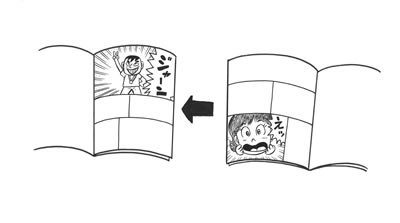 見開きページの最後のコマを「引き」、めくって次のページの最初のコマを「受け」と言い、これを併せて「めくりの効果」と言います。
